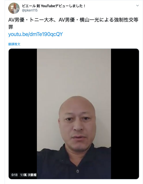 就算不懂日文,看到标题「AV男优・トニー大木、AV男优・横山一光による强制性交等罪」也知道出事了:没错,ピェール剣(Pierre剑)指控两位同样是AV男优的トニー大木(东尼大木)及横山一光强暴他的女友,影片的内容就是两位男优向被害女性谢罪: